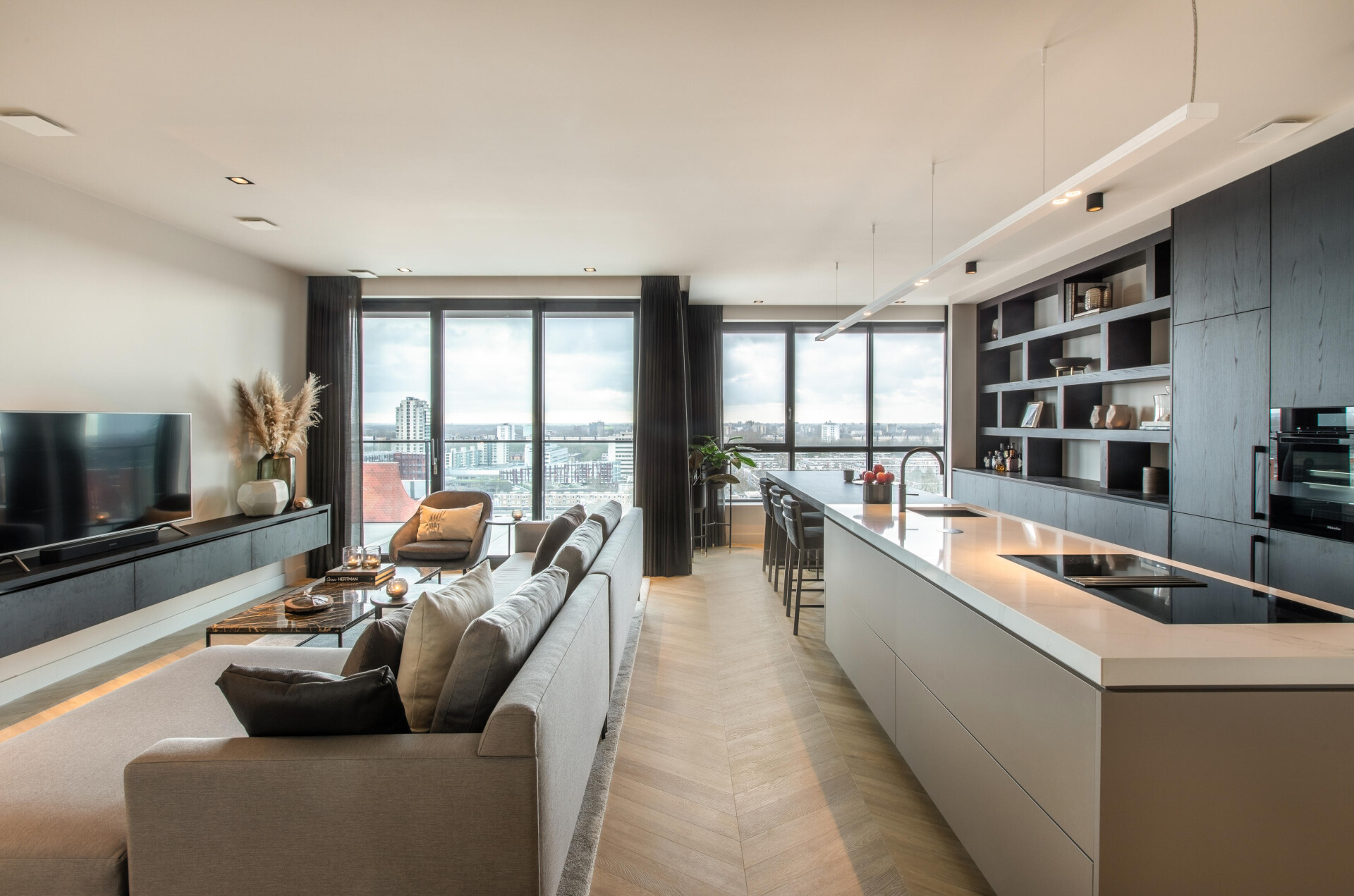 De met zorg gekozen materialen zorgen voor een luxe uitstraling. De keuze van de vloer viel op de Chevron 6541.